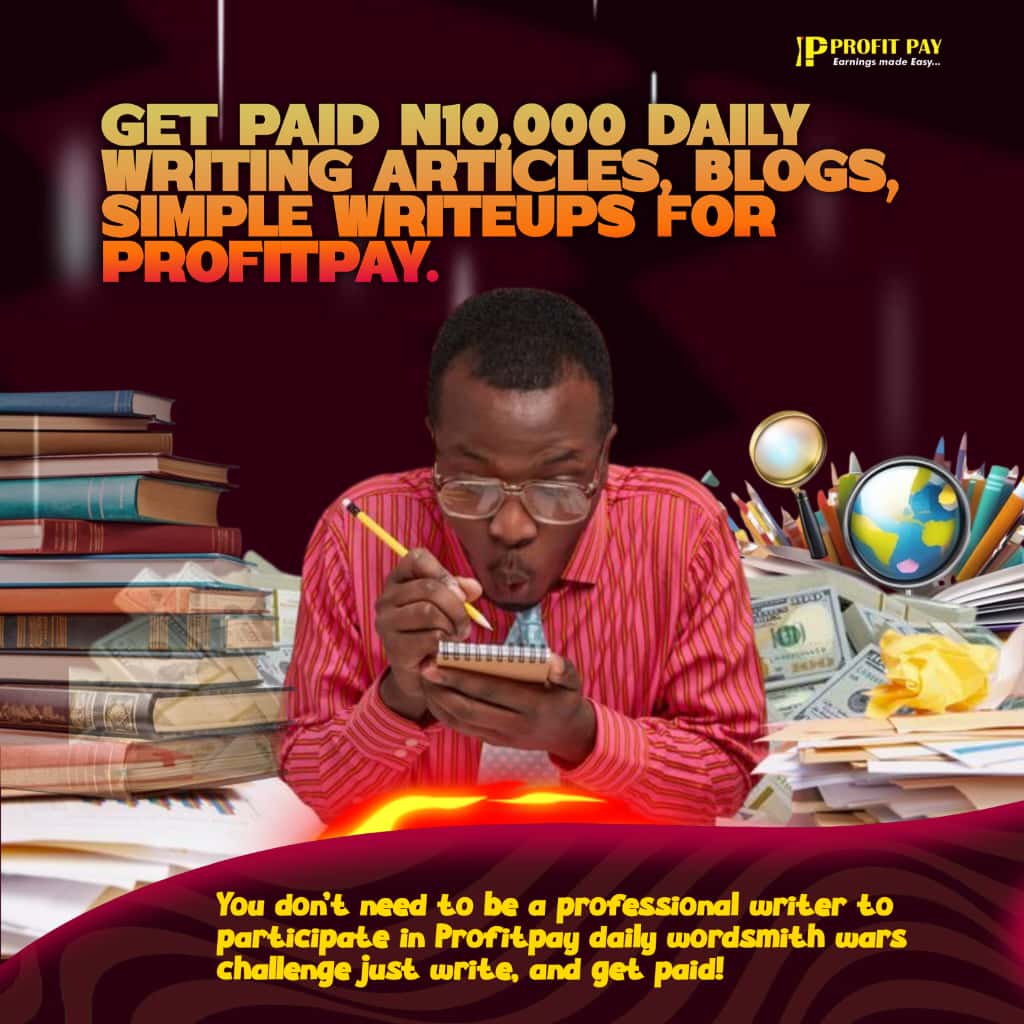 No experience needed.Join the ProfitPay Wordsmith Wars,write simple artticles and blogs,and earn ₦10,000 every single day.Start getting paid for your words.